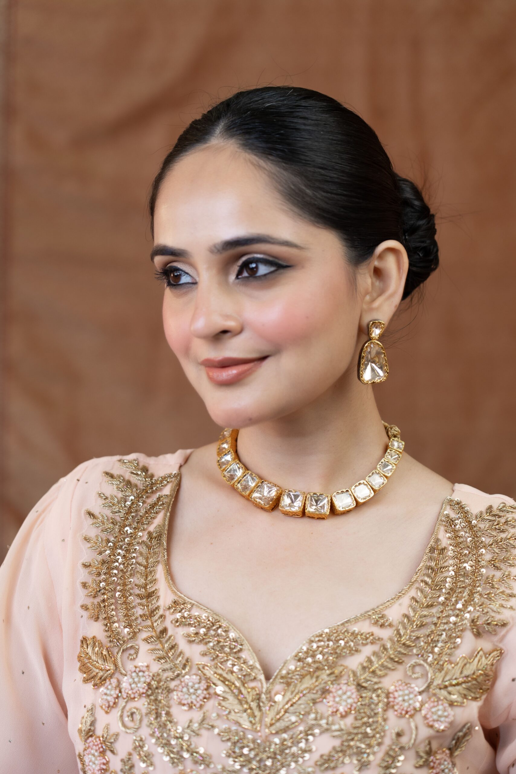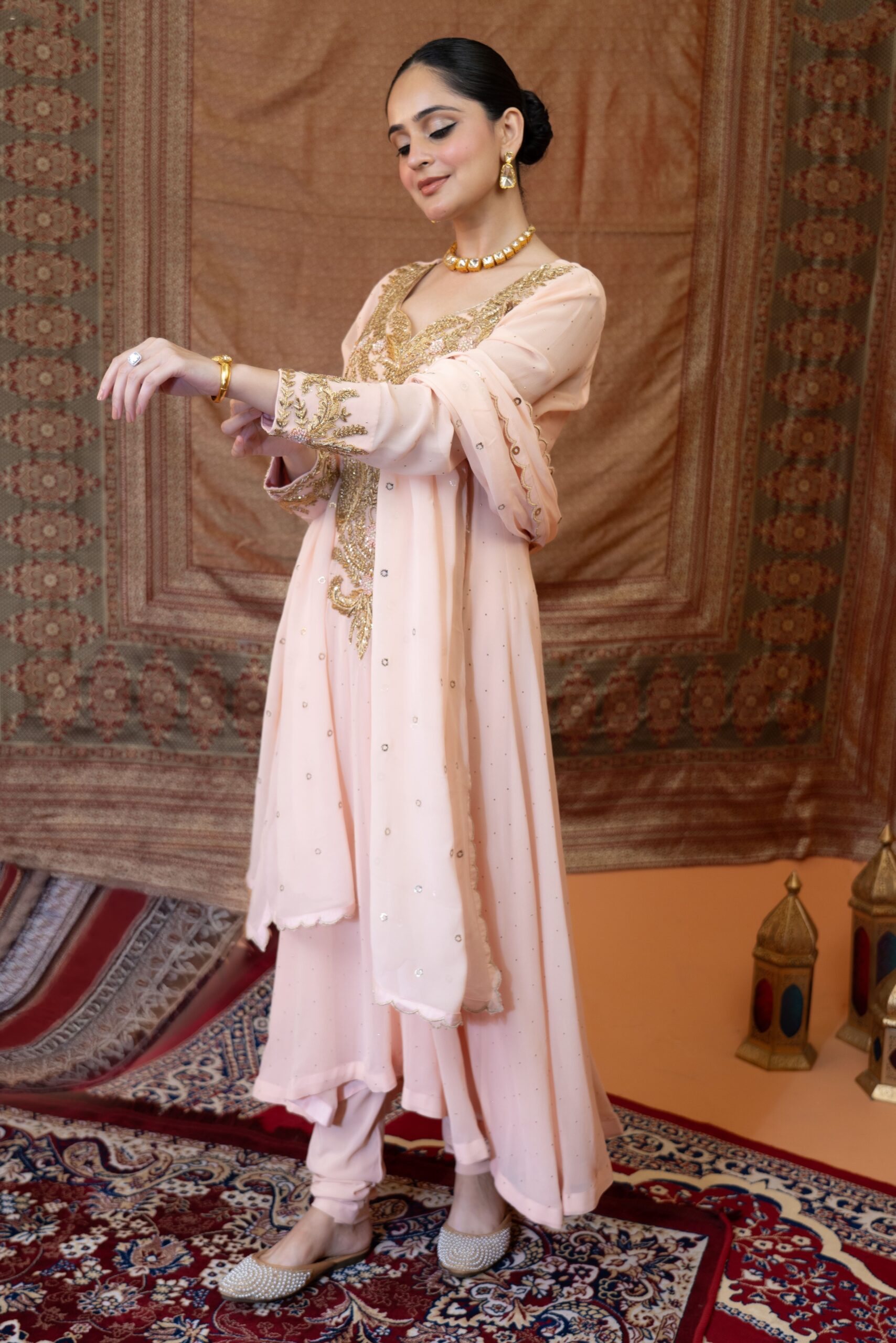 The Aarzu High-Low Anarkali Suit is crafted from premium pure georgette, featuring delicate mukaish work throughout. The neckline is beautifully adorned with heavy zardosi embroidery, while scattered mukaish detailing enhances the elegance of the entire suit. It is paired with a comfortable Lycra churidar and a ring mukaish dupatta scalloped on all for sides creating a graceful and stylish ensemble for any occasion.