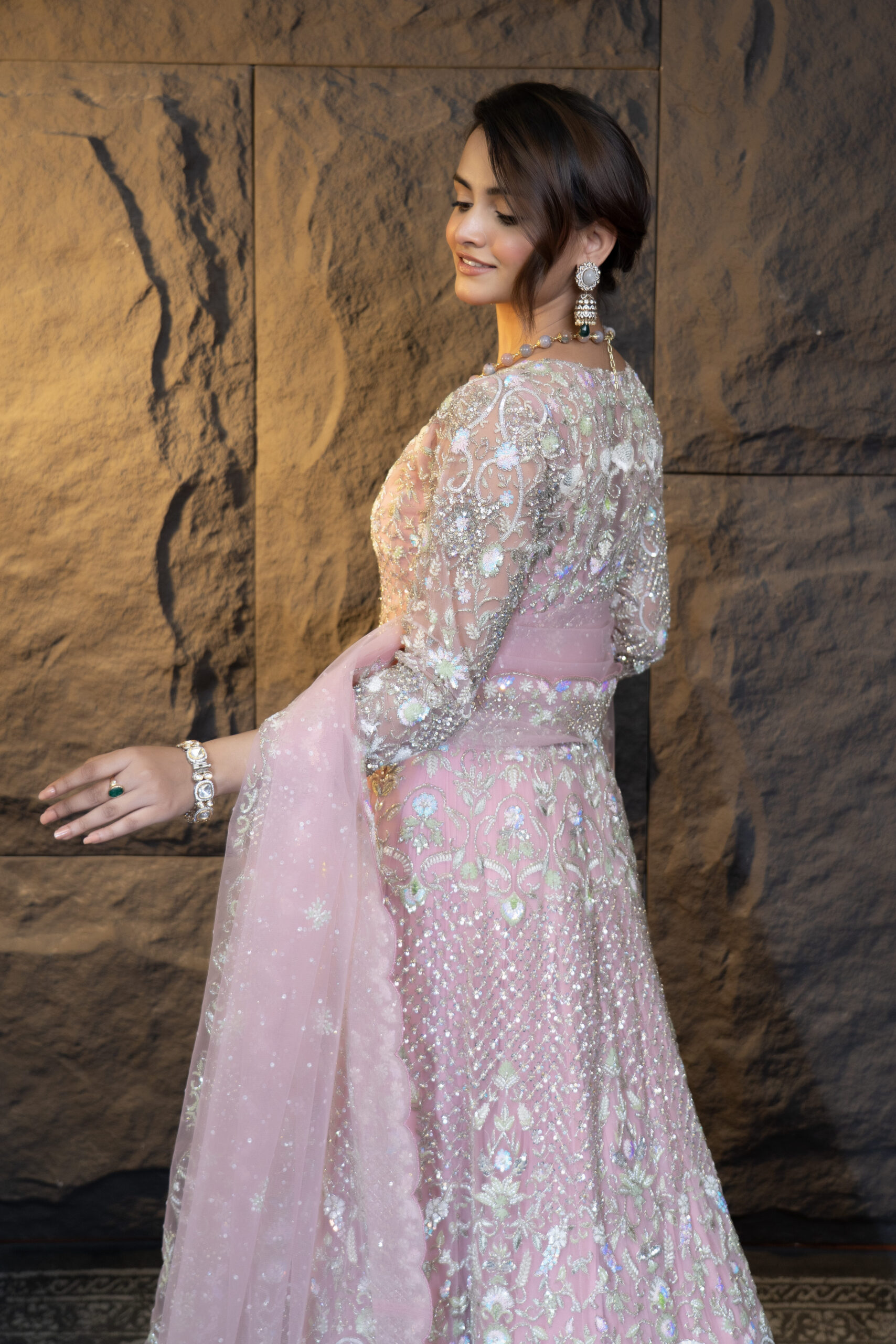 Price on RequestThe Gulab Jacket Set is a luxurious ensemble featuring a beautifully embroidered net jacket, a structured crepe corset, and a finely pleated chiffon skirt. The embroidery is inspired by contemporary design, showcasing intricate detailing with Swarovski crystals, pearls, Resham, and other modern techniques on both the front and back. The set is paired with a matching net dupatta adorned with borders on all four sides. The manually pleated skirt adds volume and grandeur, making this outfit a perfect choice for elegant occasions.