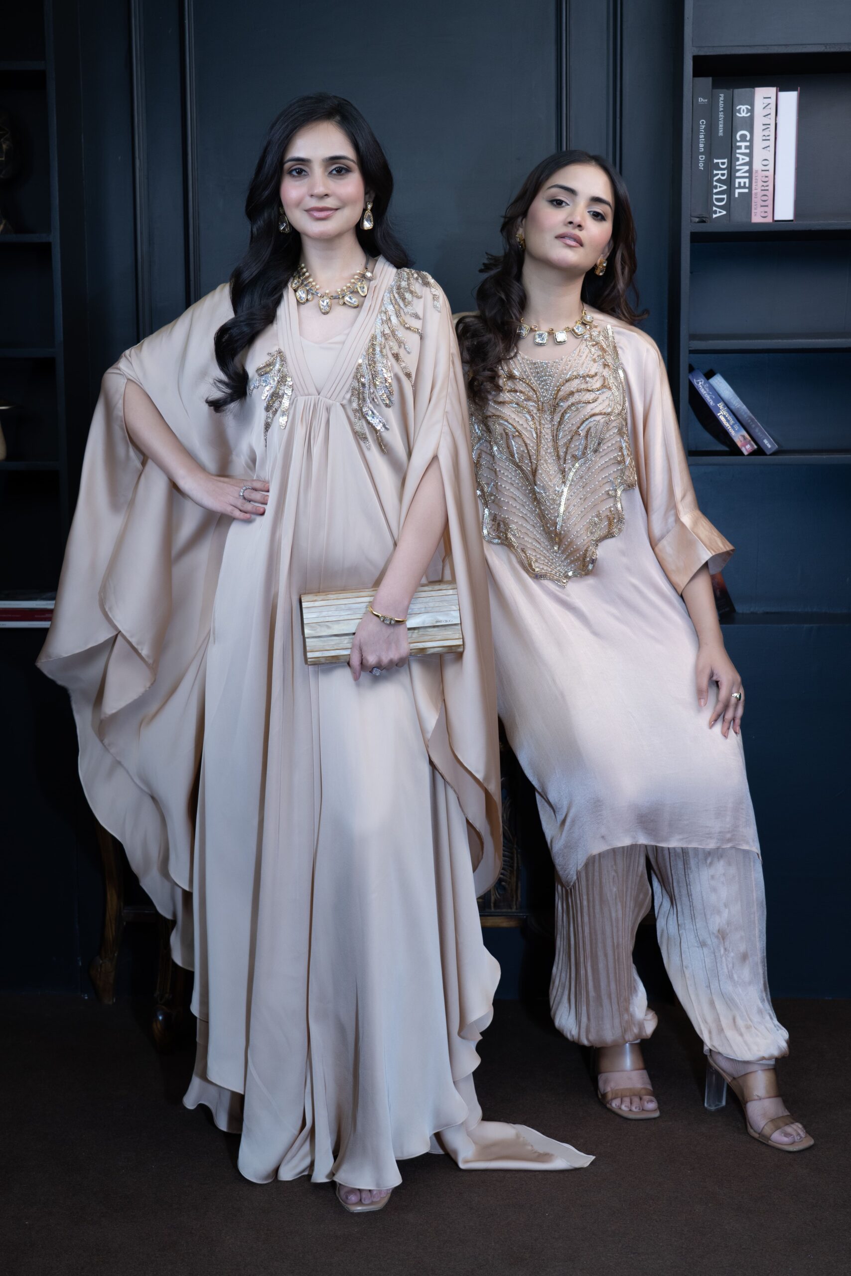 Elevate your wardrobe with our elegant Maharani Choga Set in a soft peach hue, crafted from premium chiffon material. The ensemble is beautifully embroidered with intricate gold beads, nakshi work, and pearls, creating a regal and timeless silhouette that comes with a pleated salwar. Designed for effortless wear, this set is perfect for any special occasion.