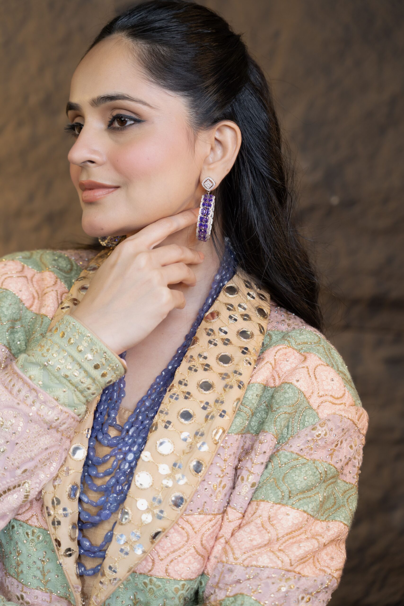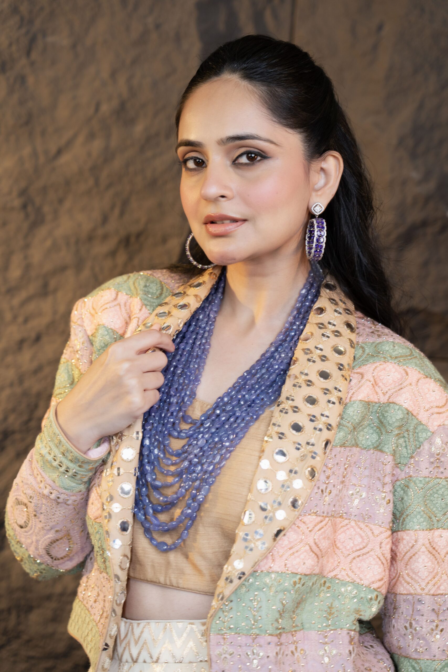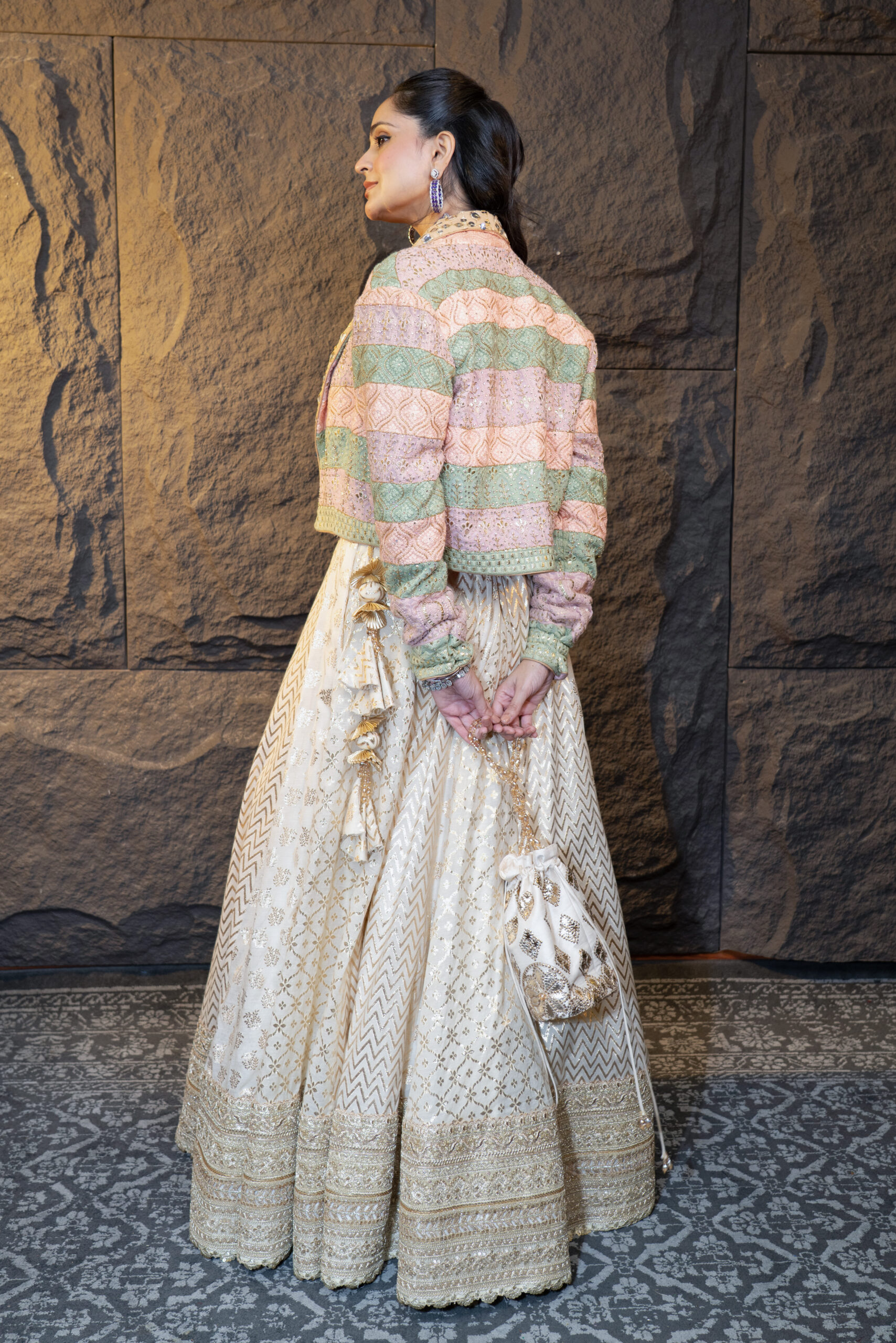 The Modern Rani Set is a contemporary masterpiece featuring a hand-embroidered multicolored Chikan Kari jacket, showcasing intricate patterns crafted through various Chikan Kari techniques. It is paired with a Chanderi silk skirt designed with a voluminous ghera and multiple ornate borders that lend it a regal and formal appeal. The ensemble is completed with a matching silk corset, creating an elegant and graceful silhouette.