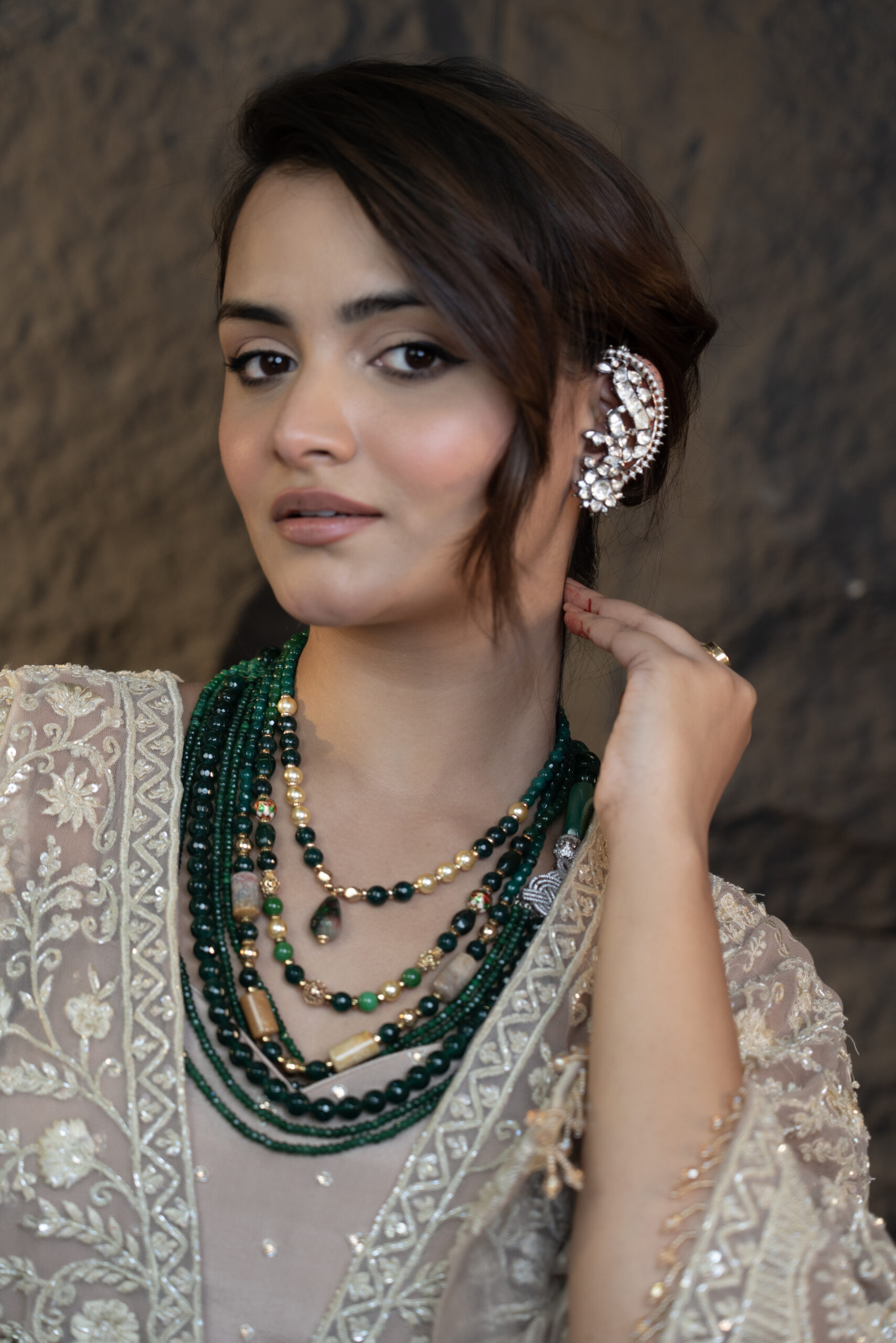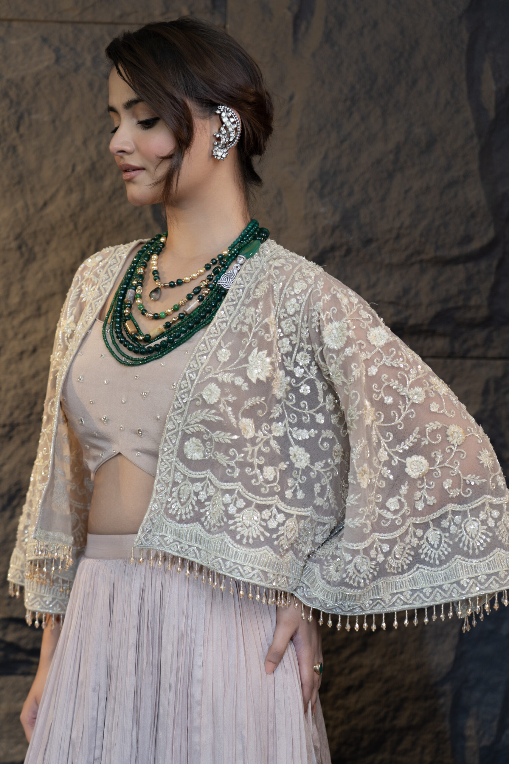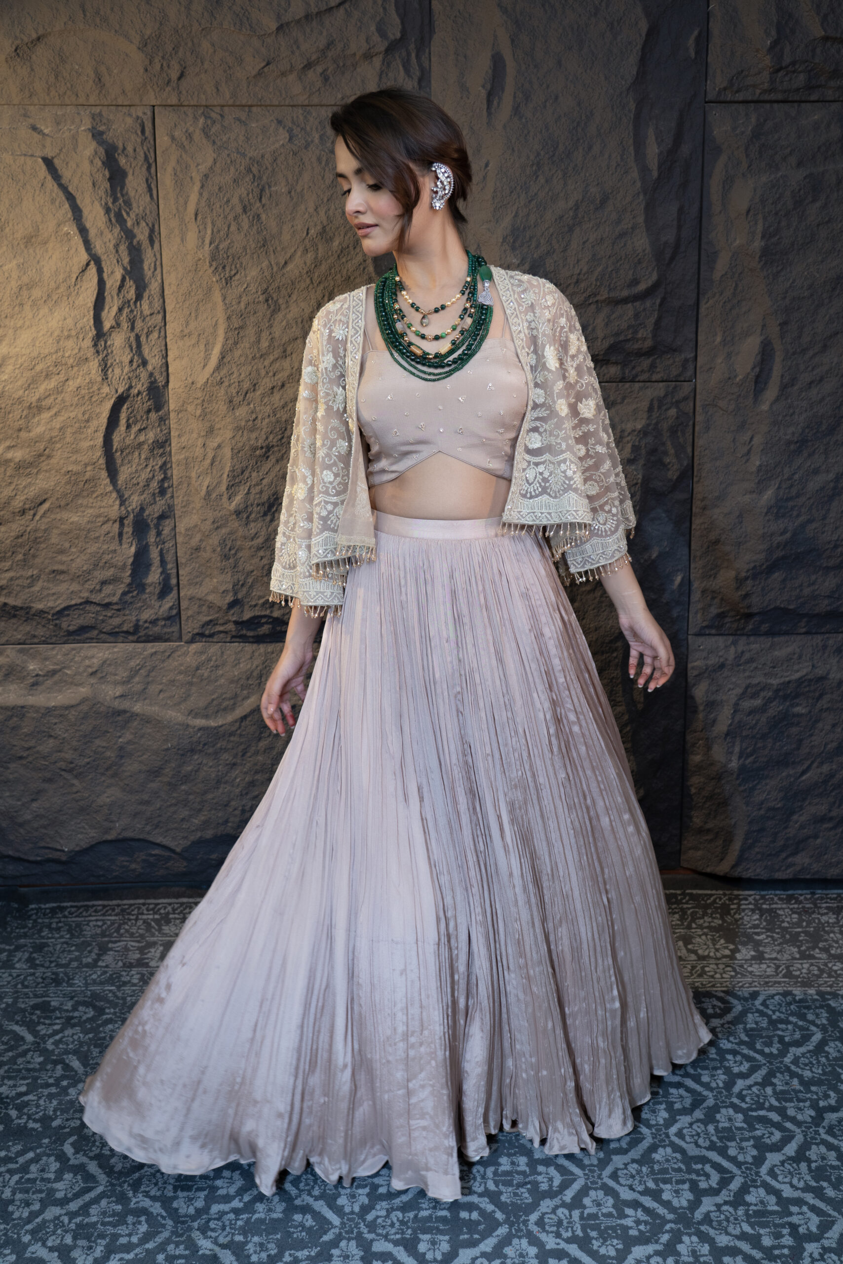 The Top Cape and Skirt Set is an exquisite ensemble featuring a net cape adorned with beautiful Resham work, highlighted with hand-applied Swarovski crystals and pearls. Dangling crystal details on the cape edges add an elegant sparkle. The look is completed with a geometrically shaped embroidered crepe corset and a pleated flared chiffon skirt, offering a perfect blend of sophistication and modern charm.